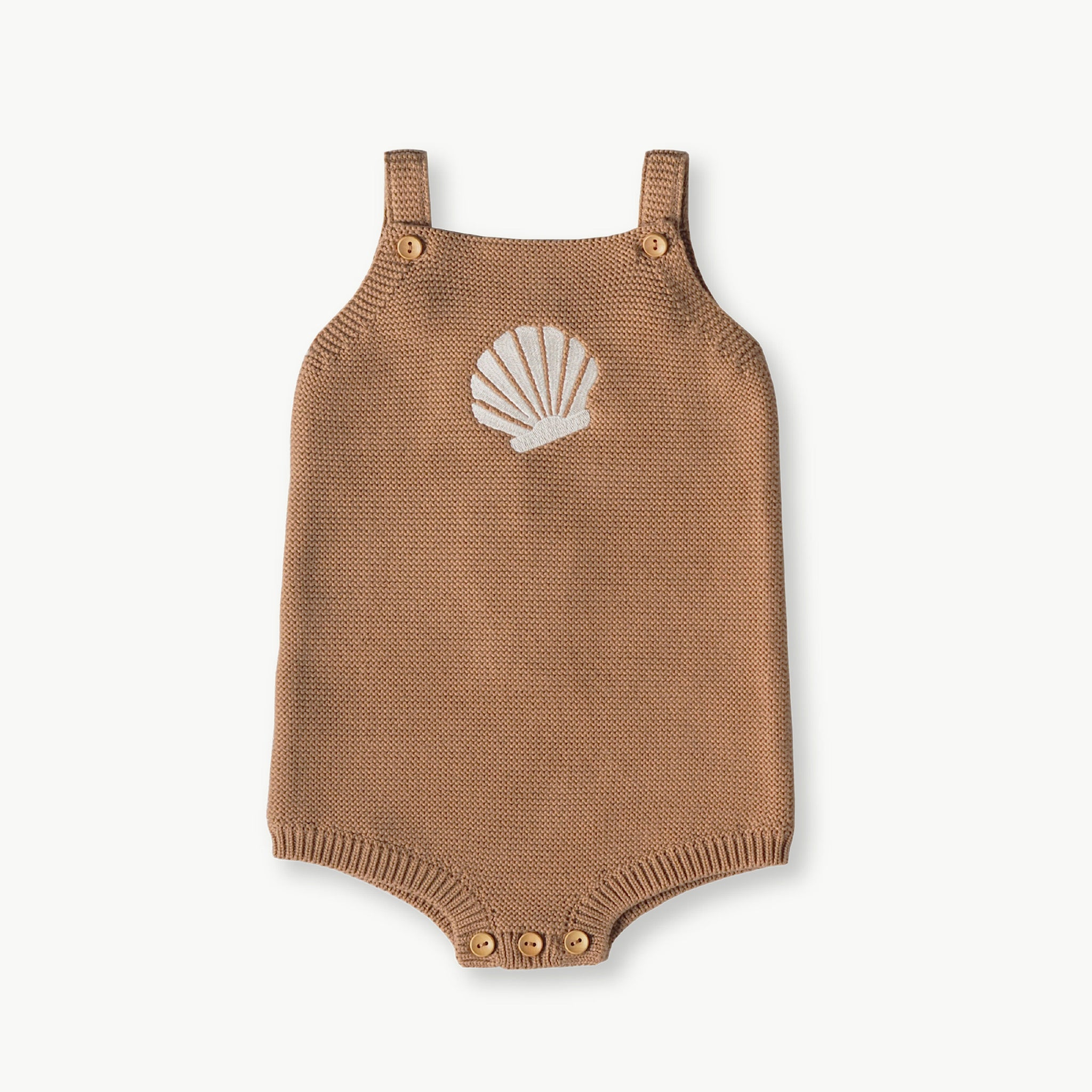 A chunky Pearl knit romper made from 100% Organic Cotton with GOTS certification. This romper features a chunky pearl knit with an embroidered clam design on the front chest. This style also has adjustable length straps and wooden buttons at crotch and straps.