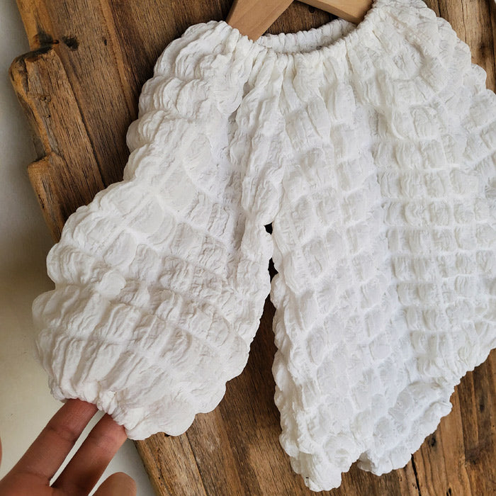 Most popular baby popcorn rompers with bonnet. It features puffy textured fabric and balloon shapes.