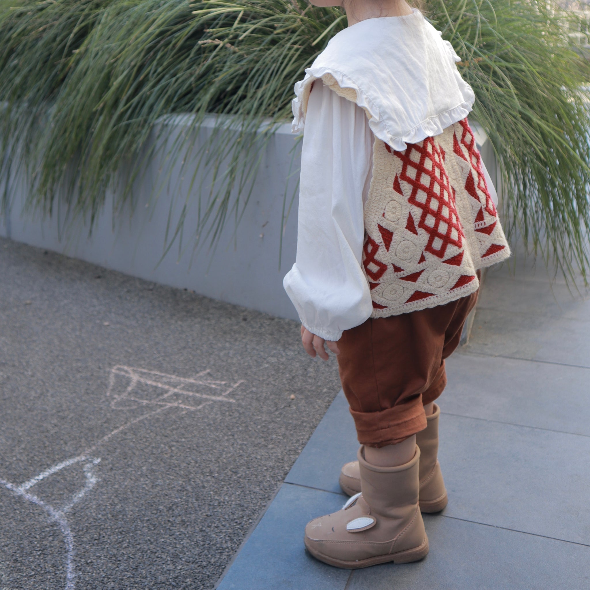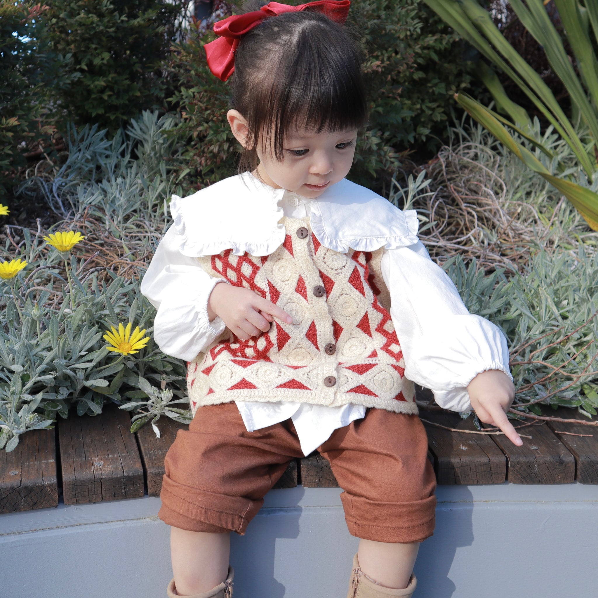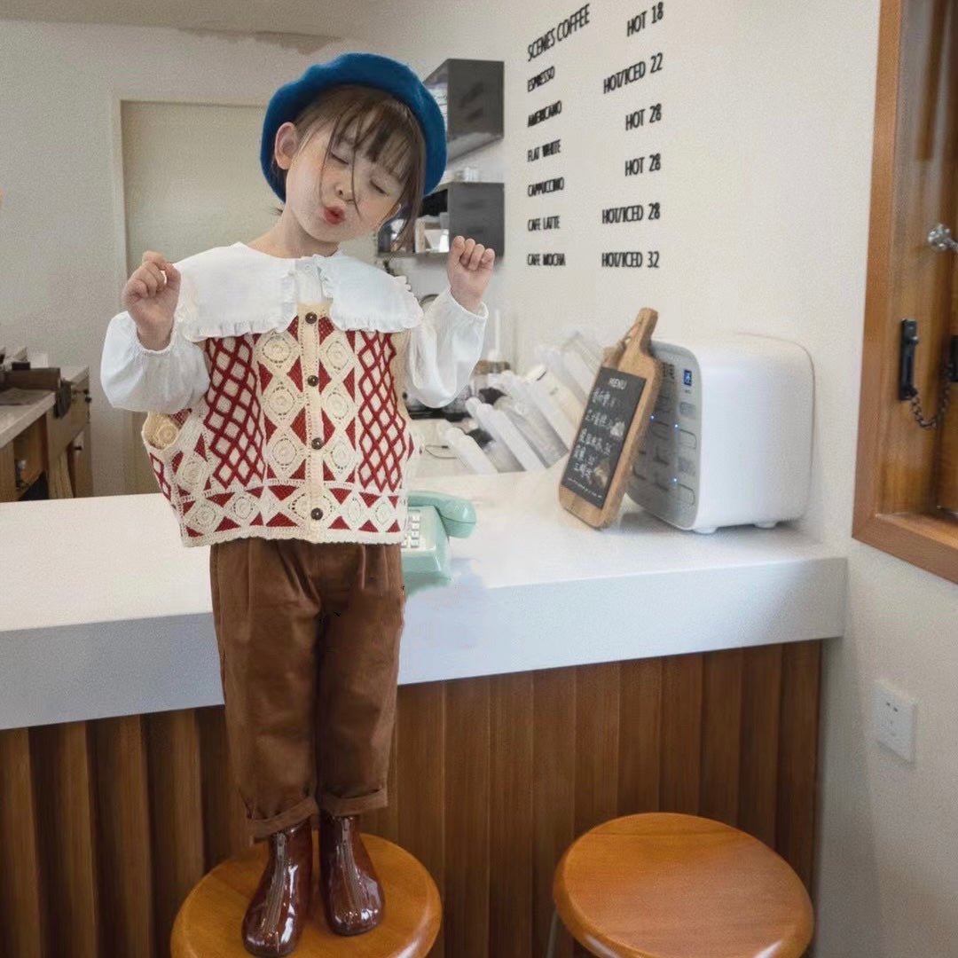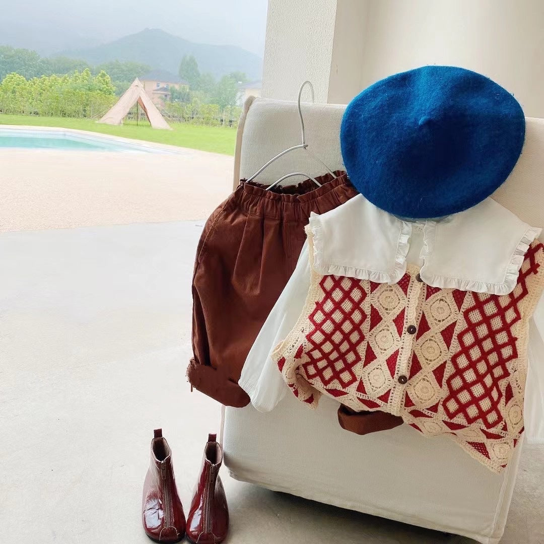 This gorgeous sets include red plaid knitted vest, white collar blouse, mocha loose pants.