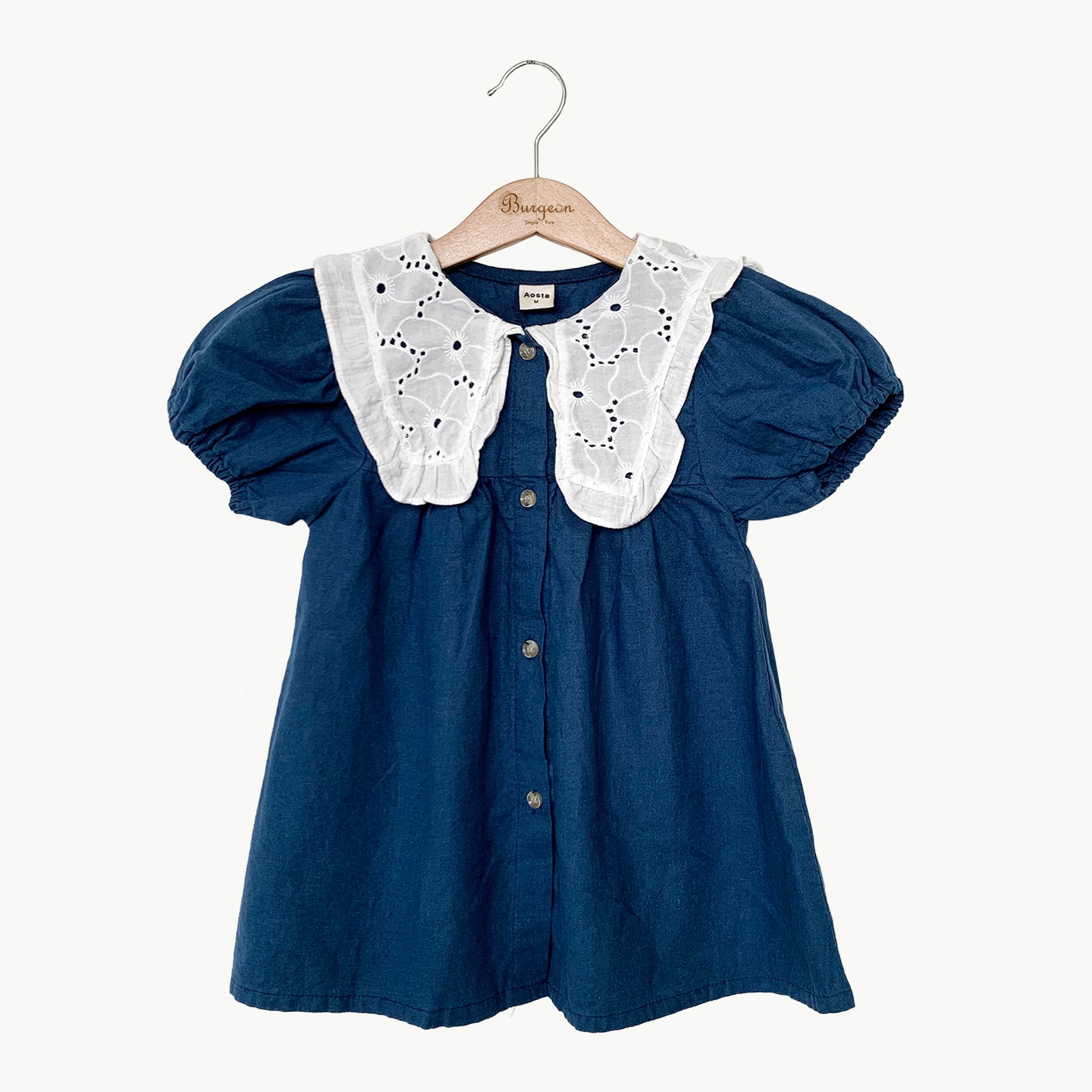A beautifully dress in washed denim blue linen and natural cotton collar detail short-sleeve dress. Perfect matching with our sunhat. It's really good to have a family look with our mom dress. Two colours available.